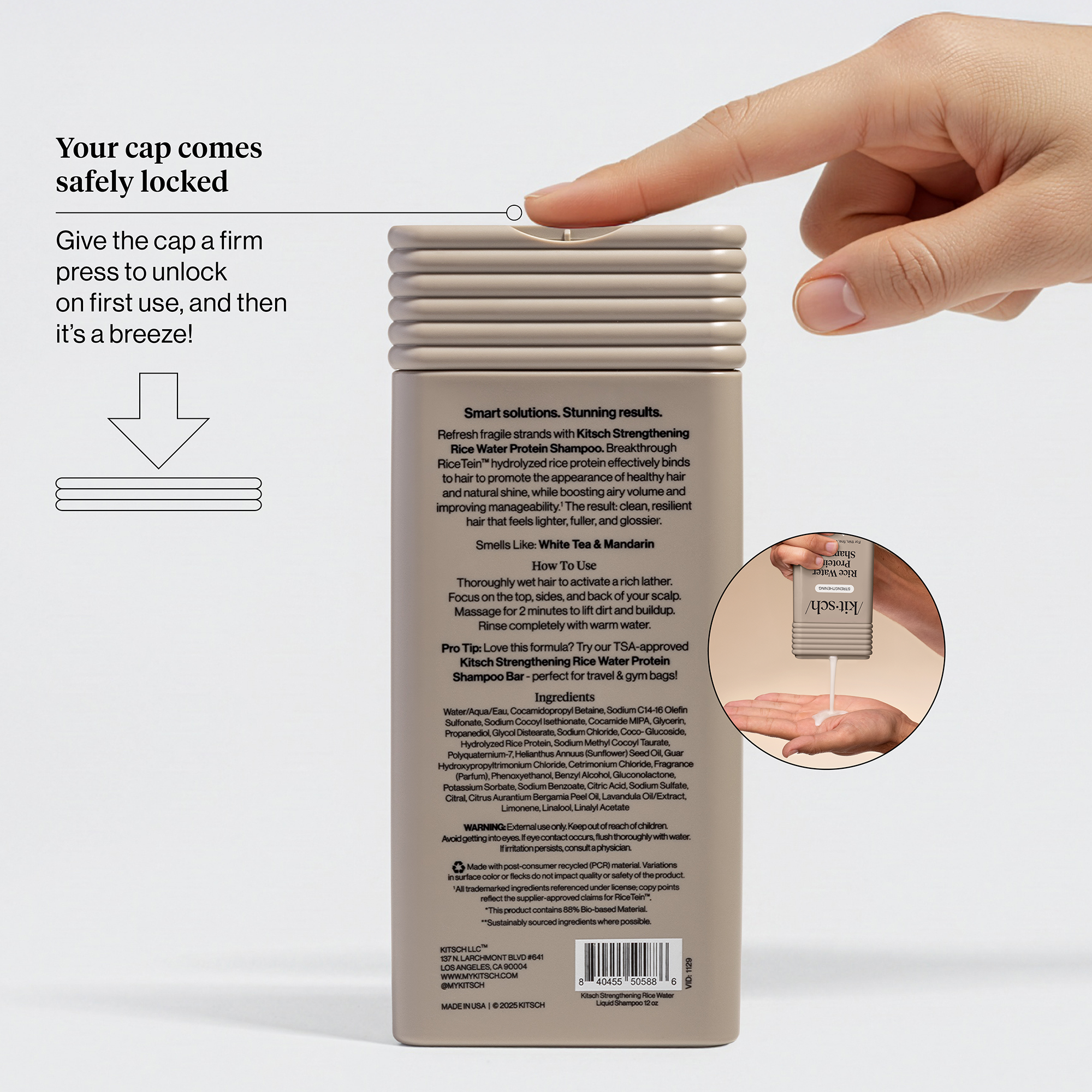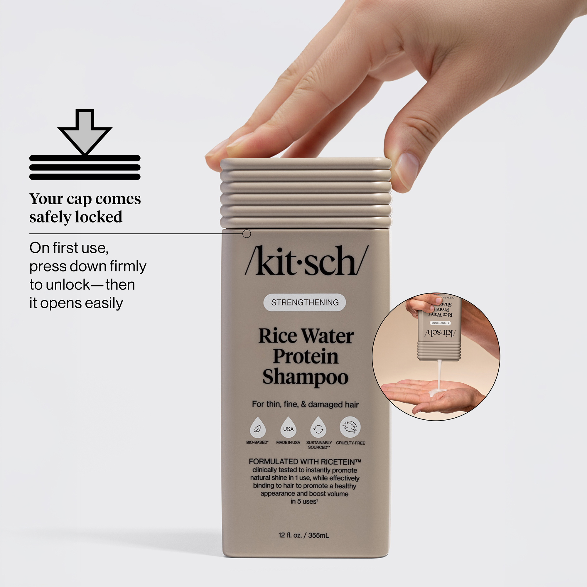 AI-generated infographic built from the original product bottle image. Hand composition, shadows, volume and textures were generated entirely with AI