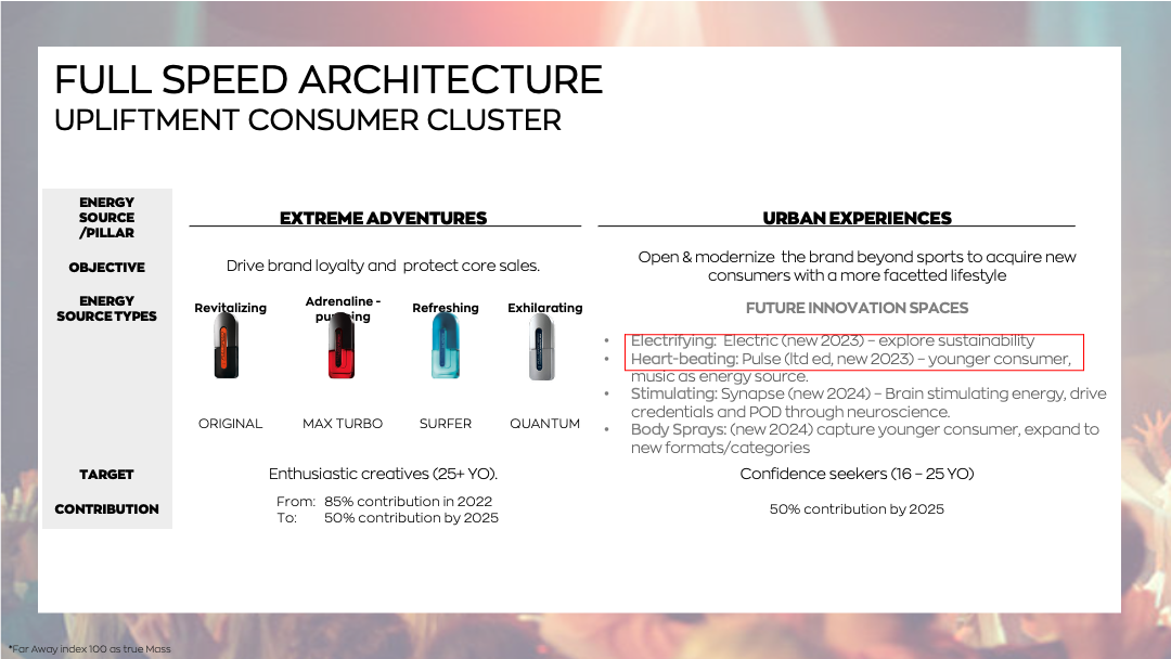 In 2022, the four core flankers — Original, Max Turbo, Surfer and Quantum — accounted for 85% of the line's revenue. The goal was to rebalance that to 50/50 by 2025 by acquiring a new consumer base through more emotional, shared experiences. Music and sound were identified as the new energy source.