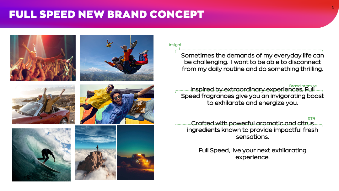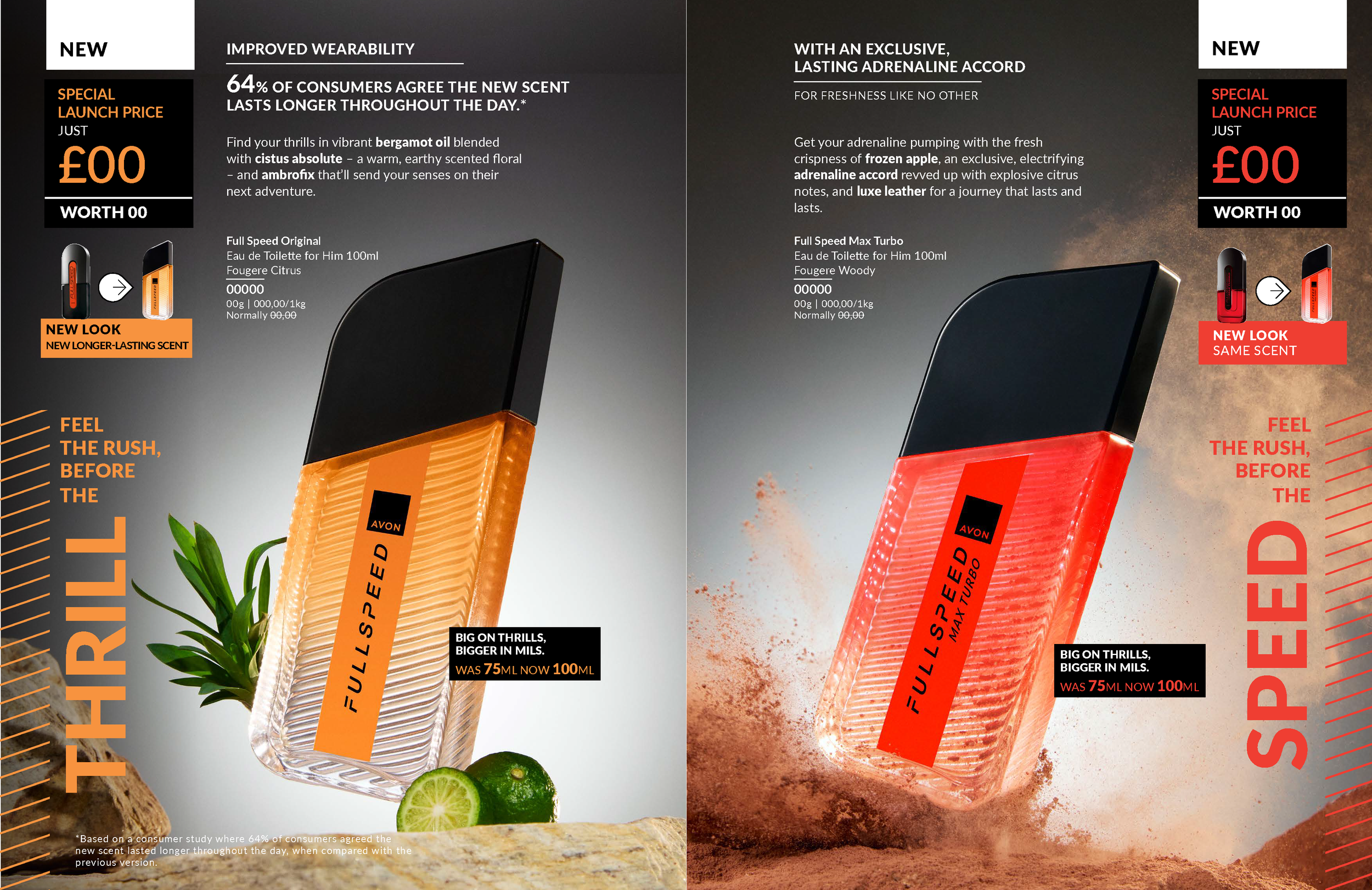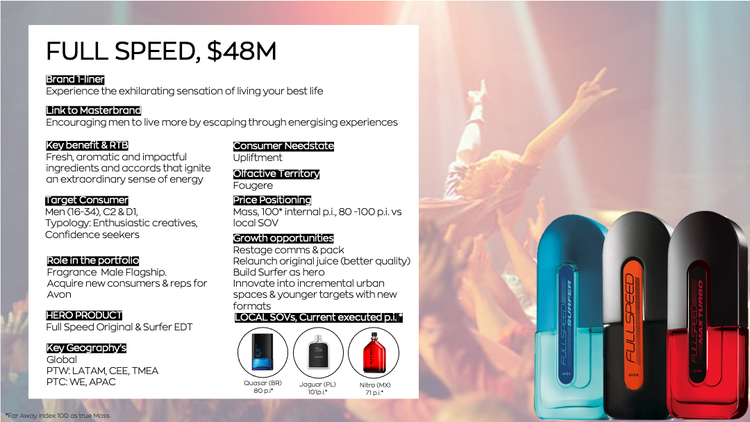 Full Speed is Avon's number one male fragrance globally, a $48M brand sold across more than 100 countries. The line needed more than a visual refresh. The brief called for a full strategic relaunch: new bottle, new visual identity, new photographic language across all flankers simultaneously, and a repositioning that would open the brand beyond its traditional extreme sports territory toward younger, more urban consumers.